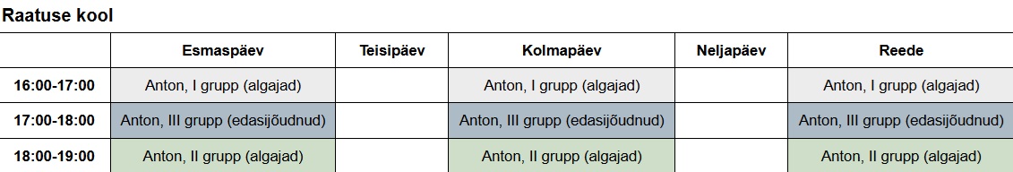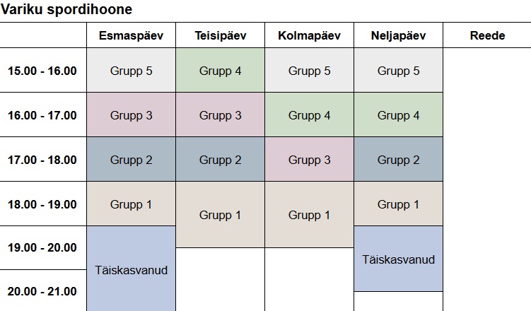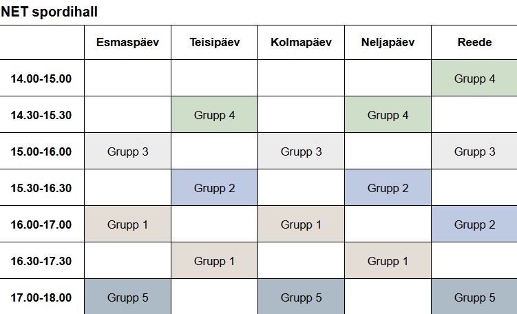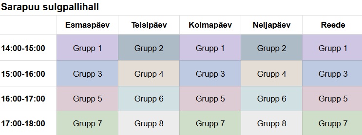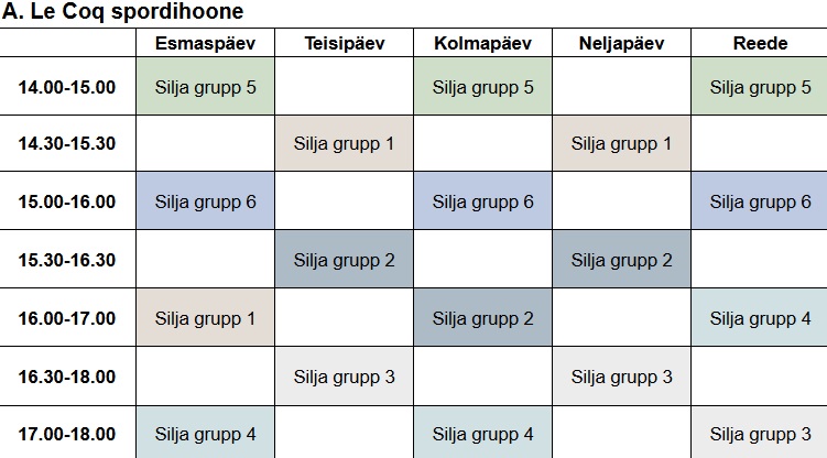 A. Le Coq spordihoone NET spordihall Raatuse kool Variku spordihoone Sarapuu sulgpallihall Treeninggraafikud Eliit I, Eliit II ja Kasela I – A. Le Coq spordihoones E 10:00-11:00 E 18:00-21:00 T 18:00-21:00 K 18:00-21:00 N 18:00-21:00 R 18:00-21:00 P 16:00-18:00